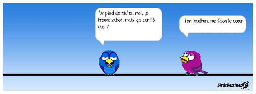 Case 1: | Case 2: Bird 1: Un pied de biche, moi, je trouve sabot, mais ça cerf à quoi ? | Case 3: Bird 1: Ton inculture me faon le cœur