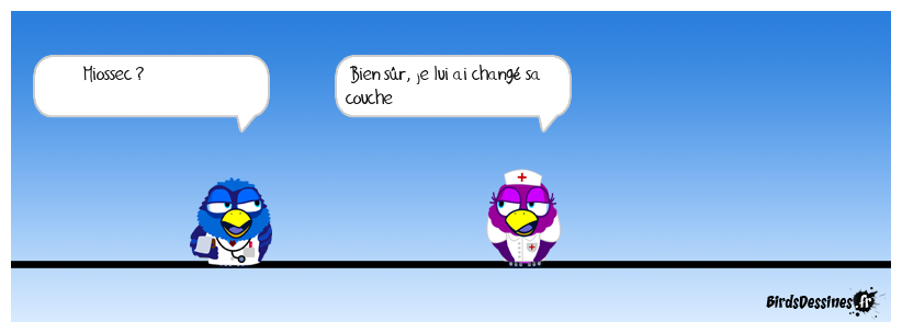 Case 1:Bird 1: Miossec ? | Case 2: Bird 1: Bien sûr, je lui ai changé sa couche | Case 3: