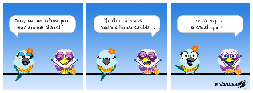 Case 1:Bird 1: Mamy, quel mari choisir pour vivre un amour éternel ? | Case 2: Bird 1: Ma p'tite, si tu veux goûter à l'amour durable ... | Case 3: Bird 1: ... ne choisis pas un chaud lapin !