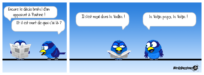 Case 1:Bird 1: Encore le décès brutal d'un opposant à Poutine !Bird 2: Et il est mort de quoi c'ui là ? | Case 2: Bird 1: Il s'est noyé dans la Vodka ! | Case 3: Bird 1: la Volga papy, la Volga !