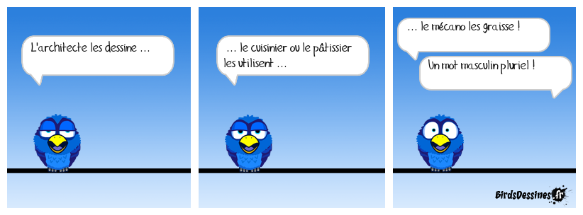 Case 1:Bird 1: L'architecte les dessine ... | Case 2: Bird 1: ... le cuisinier ou le pâtissier les utilisent ... | Case 3: Bird 1: ... le mécano les graisse ! Bird 2: Un mot masculin pluriel !