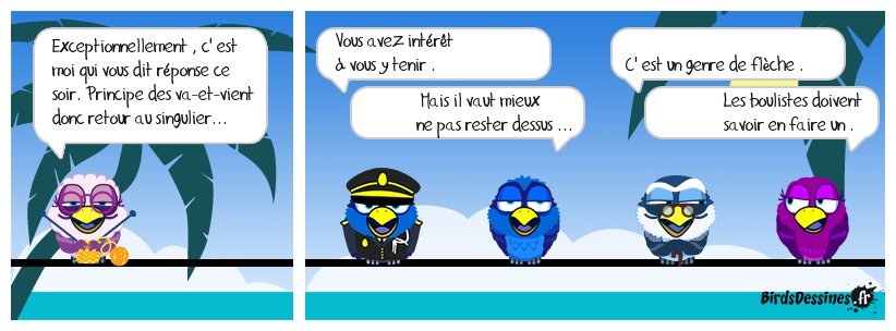 Case 1:Bird 1: Exceptionnellement , c' est moi qui vous dit réponse ce soir. Principe des va-et-vient donc retour au singulier... | Case 2: Bird 1: Vous avez intérêt à vous y tenir . Bird 2: Mais il vaut mieux ne pas rester dessus ... | Case 3: Bird 1: C' est un genre de flèche . Bird 2: Les boulistes doivent savoir en faire un .
