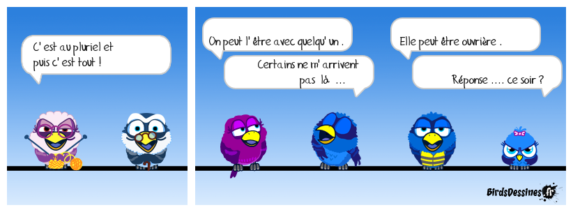 Case 1:Bird 1: C' est au pluriel et puis c' est tout ! | Case 2: Bird 1: On peut l' être avec quelqu' un . Bird 2: Certains ne m' arrivent pas là ... | Case 3: Bird 1: Elle peut être ouvrière . Bird 2: Réponse .... ce soir ?
