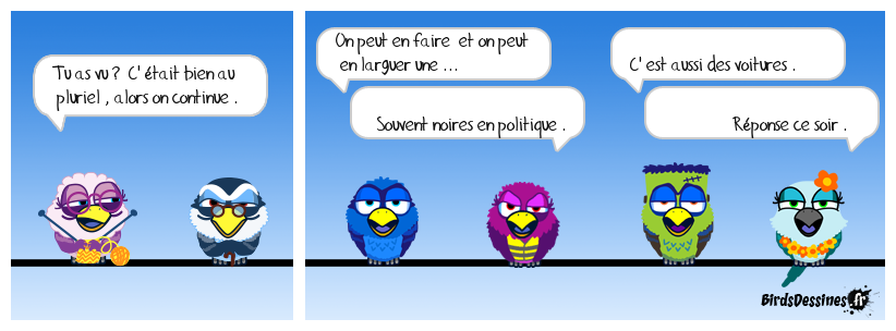 Case 1:Bird 1: Tu as vu ? C' était bien au pluriel , alors on continue . | Case 2: Bird 1: On peut en faire et on peut en larguer une ... Bird 2: Souvent noires en politique . | Case 3: Bird 1: C' est aussi des voitures . Bird 2: Réponse ce soir .