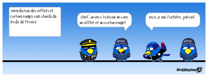 Case 1:Bird 1: interdiction des sifflets et cartons rouges aux abords du stade de France | Case 2: Bird 1: chef, on en a tabassé un avec un sifflet et un carton rouge! | Case 3: Bird 1: mais je suis l'arbitre, putain!