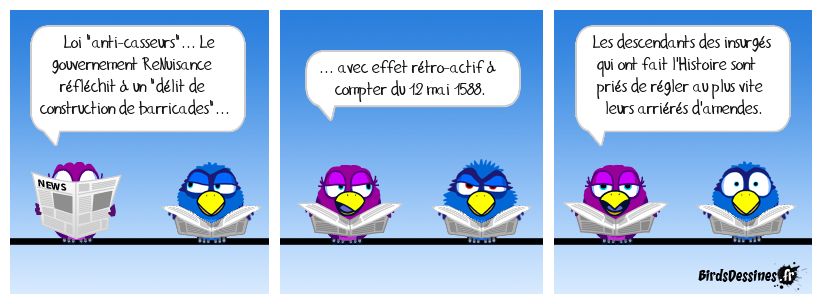 Case 1:Bird 1: Loi "anti-casseurs"... Le gouvernement ReNuisance réfléchit à un "délit de construction de barricades"... | Case 2: Bird 1: ... avec effet rétro-actif à compter du 12 mai 1588. | Case 3: Bird 1: Les descendants des insurgés qui ont fait l'Histoire sont priés de régler au plus vite leurs arriérés d'amendes.