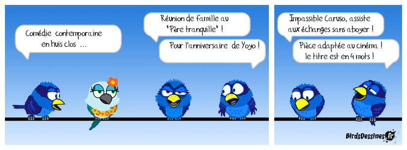 Case 1:Bird 1: Comédie contemporaine en huis clos ... | Case 2: Bird 1: Réunion de famille au "Père tranquille" ! Bird 2: Pour l'anniversaire de Yoyo ! | Case 3: Bird 1: Impassible Caruso, assiste aux échanges sans aboyer ! Bird 2: Pièce adaptée au cinéma ! le titre est en 4 mots !