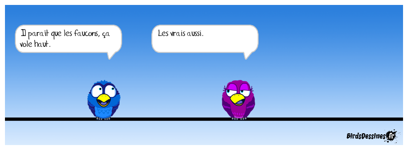 Case 1:Bird 1: Il paraît que les faucons, ça vole haut. | Case 2: Bird 1: Les vrais aussi. | Case 3: