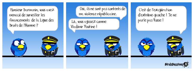 Case 1:Bird 1: Monsieur Darmanin, vous avez menacé de surveiller les financements de la Ligue des Droits de l'Homme ? | Case 2: Bird 1: Oui, ils ne sont pas contents de ma violence républicaine. Bird 2: Là, vous agissez comme Vladimir Poutine ! | Case 3: Bird 1: C'est de l'exagération d'extrême-gauche ! Je ne parle pas Russe !