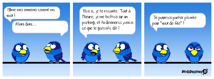 Case 1:Bird 1: Même mes ennemis aiment ma voix !Bird 2: Allons donc... | Case 2: Bird 1: Mais si, je te raconte. Tout à l'heure, je me battais sur un parking, et tu devineras jamais ce que le gars m'a dit ! | Case 3: Bird 1: Je pourrais porter plainte pour "voix de fée" !