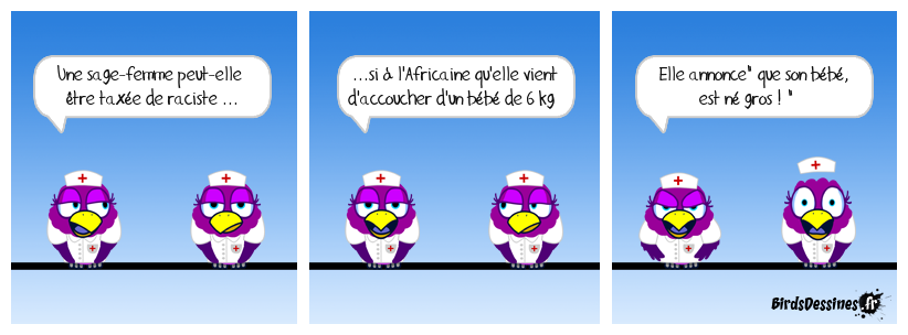 Case 1:Bird 1: Une sage-femme peut-elle être taxée de raciste ... | Case 2: Bird 1: ...si à l'Africaine qu'elle vient d'accoucher d'un bébé de 6 kg | Case 3: Bird 1: Elle annonce" que son bébé, est né gros ! "
