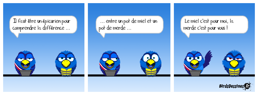 Case 1:Bird 1: Il faut être un épicurien pour comprendre la différence ... | Case 2: Bird 1: ... entre un pot de miel et un pot de merde ... | Case 3: Bird 1: Le miel c'est pour moi, la merde c'est pour vous !