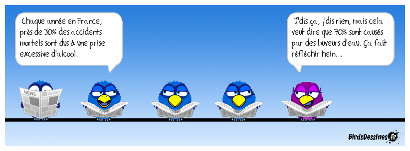 Case 1:Bird 1: Chaque année en France, près de 30% des accidents mortels sont dus à une prise excessive d'alcool. | Case 2: | Case 3: Bird 1: J'dis ça, j'dis rien, mais cela veut dire que 70% sont causés par des buveurs d'eau. Ça fait réfléchir hein...