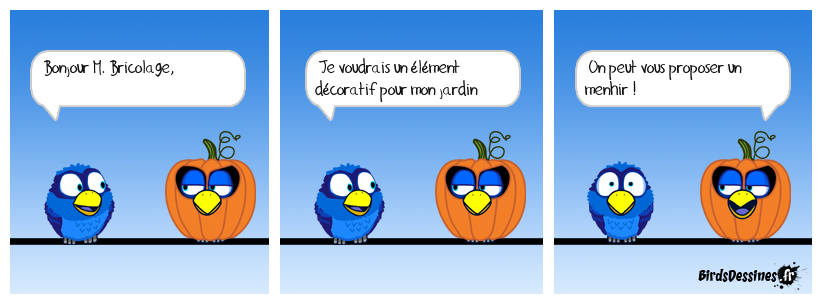 Case 1:Bird 1: Bonjour M. Bricolage, | Case 2: Bird 1: Je voudrais un élément décoratif pour mon jardin | Case 3: Bird 1: On peut vous proposer un menhir !