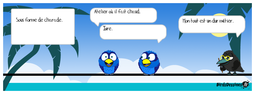 Case 1:Bird 1: Sous forme de charade. | Case 2: Bird 1: Atelier où il fait chaud. Bird 2: Ivre. | Case 3: Bird 1: Mon tout est un dur métier.