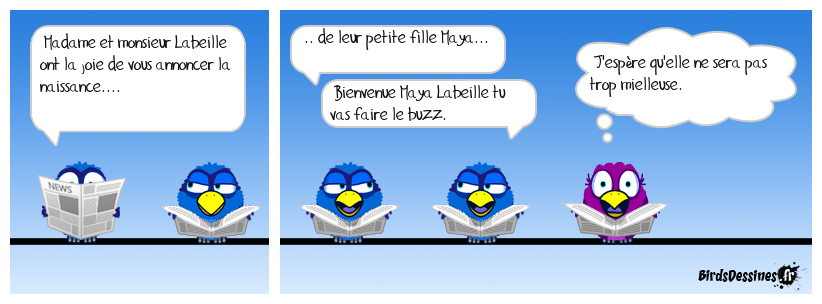 Case 1:Bird 1: Madame et monsieur Labeille ont la joie de vous annoncer la naissance.... | Case 2: Bird 1: .. de leur petite fille Maya... Bird 2: Bienvenue Maya Labeille tu vas faire le buzz. | Case 3: Bird 1: J'espère qu'elle ne sera pas trop mielleuse.