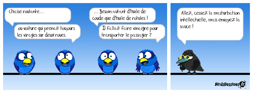 Case 1:Bird 1: Chaise roulante...Bird 2: ou voiture qui prenait toujours les virages sur deux roues. | Case 2: Bird 1: ... Besoin autant d'huile de coude que d'huile de rotules ! Bird 2: Il fallait faire vinaigre pour transporter le passager ? | Case 3: Bird 1: Allez, cessez la masturbation intellectuelle, mais envoyez la sauce !