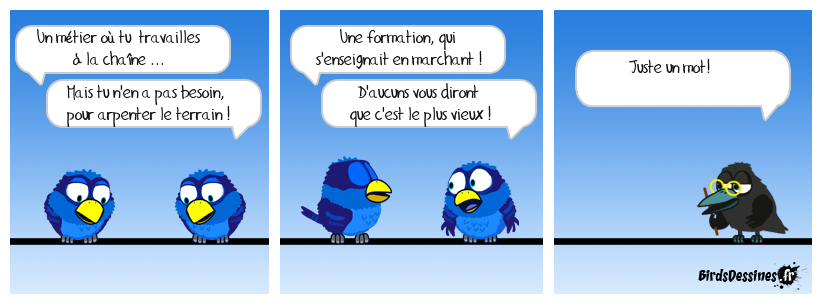 Case 1:Bird 1: Un métier où tu travailles à la chaïne ...Bird 2: Mais tu n'en a pas besoin, pour arpenter le terrain ! | Case 2: Bird 1: Une formation, qui s'enseignait en marchant ! Bird 2: D'aucuns vous diront que c'est le plus vieux ! | Case 3: Bird 1: Juste un mot!
