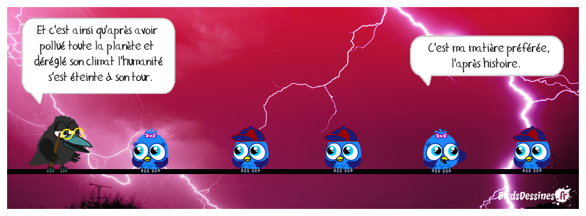 Case 1:Bird 1: Et c'est ainsi qu'après avoir pollué toute la planète et déréglé son climat l'humanité s'est éteinte à son tour. | Case 2: | Case 3: Bird 1: C'est ma matière préférée, l'après histoire.