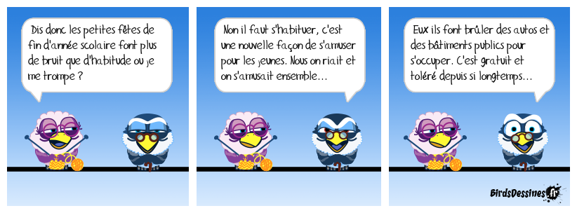 Case 1:Bird 1: Dis donc les petites fêtes de fin d'année scolaire font plus de bruit que d'habitude ou je me trompe ? | Case 2: Bird 1: Non il faut s'habituer, c'est une nouvelle façon de s'amuser pour les jeunes. Nous on riait et on s'amusait ensemble... | Case 3: Bird 1: Eux ils font brûler des autos et des bâtiments publics pour s'occuper. C'est gratuit et toléré depuis si longtemps...