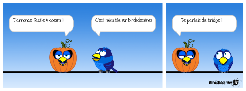 Case 1:Bird 1: J'annonce facile 4 coeurs ! | Case 2: Bird 1: C'est minable sur birdsdessines | Case 3: Bird 1: Je parlais de bridge !