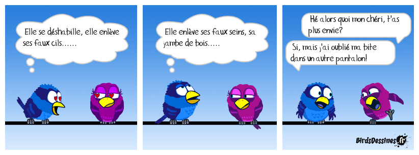 Case 1:Bird 1: Elle se déshabille, elle enlève ses faux cils...... | Case 2: Bird 1: Elle enlève ses faux seins, sa jambe de bois..... | Case 3: Bird 1: Hé alors quoi mon chéri, t'as plus envie? Bird 2: Si, mais j'ai oublié ma bite dans un autre pantalon!