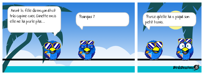 Case 1:Bird 1: Avant la fille du maçon était très copine avec Ginette mais elle ne lui parle plus... | Case 2: Bird 1: Pourquoi ? | Case 3: Bird 1: Parce qu'elle lui a piqué son petit tamis.