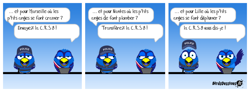 Case 1:Bird 1: ... et pour Marseille où les p'tits anges se font cramer ?Bird 2: Envoyez la C.R.S 8 ! | Case 2: Bird 1: ... et pour Nantes où les p'tits anges de font plomber ? Bird 2: Transférez la C.R.S 8 ! | Case 3: Bird 1: ... et pour Lille où les p'tits anges se font déplumer ? Bird 2: la C.R.S 8 vous dis-je !
