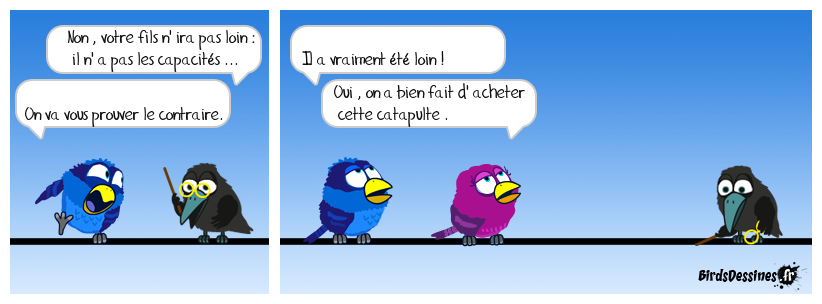 Case 1:Bird 1: Non , votre fils n' ira pas loin : il n' a pas les capacités ...Bird 2: On va vous prouver le contraire. | Case 2: Bird 1: Il a vraiment été loin ! Bird 2: Oui , on a bien fait d' acheter cette catapulte . | Case 3: