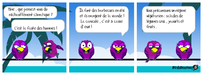 Case 1:Bird 1: Mme , que pensez-vous du réchauffement climatique ?Bird 2: C'est la faute des hommes ! | Case 2: Bird 1: Ils font des barbecues en été et ils mangent de la viande ! La canicule , c' est à cause d' eux ! | Case 3: Bird 1: Nous préconisons un régime végétarien : salades de légumes crus , yaourts et fruits .