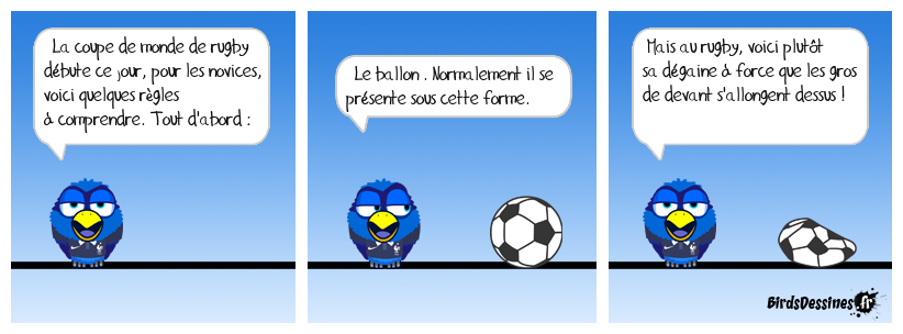 Case 1:Bird 1: La coupe de monde de rugby débute ce jour, pour les novices, voici quelques règles à comprendre. Tout d'abord : | Case 2: Bird 1: Le ballon . Normalement il se présente sous cette forme. | Case 3: Bird 1: Mais au rugby, voici plutôt sa dégaine à force que les gros de devant s'allongent dessus !