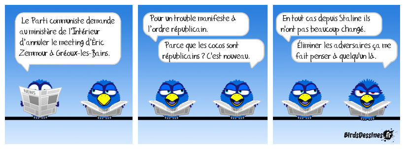 Case 1:Bird 1: Le Parti communiste demande au ministère de l’Intérieur d’annuler le meeting d’Éric Zemmour à Gréoux-les-Bains. | Case 2: Bird 1: Pour un trouble manifeste à l’ordre républicain. Bird 2: Parce que les cocos sont républicains ? C'est nouveau. | Case 3: Bird 1: En tout cas depuis Staline ils n'ont pas beaucoup changé. Bird 2: Èliminer les adversaires ça me fait penser à quelqu'un là.