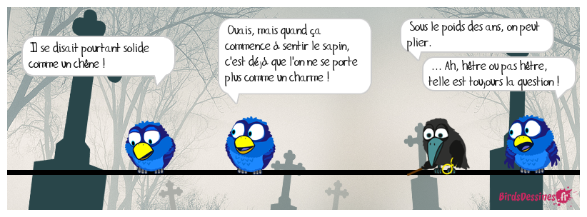 Case 1:Bird 1: Il se disait pourtant solide comme un chêne ! | Case 2: Bird 1: Ouais, mais quand ça commence à sentir le sapin, c'est déjà que l'on ne se porte plus comme un charme ! | Case 3: Bird 1: Sous le poids des ans, on peut plier. Bird 2: ... Ah, hêtre ou pas hêtre, telle est toujours la question !