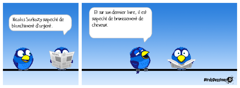 Case 1:Bird 1: Nicolas Sarkozy suspecté de blanchiment d'argent. | Case 2: Bird 1: Et sur son dernier livre, il est suspecté de brunissement de cheveux. | Case 3: