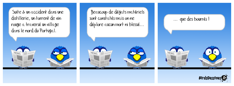 Case 1:Bird 1: Suite à un accident dans une distillerie, un torrent de vin rouge a traversé un village dans le nord du Portugal. | Case 2: Bird 1: Beaucoup de dégats matériels sont constatés mais on ne déplore aucun mort ni blessé... | Case 3: Bird 1: ... que des bourrés !
