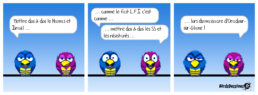 Case 1:Bird 1: Mettre dos à dos le Hamas et Israël ... | Case 2: Bird 1: ... comme le fait L.F.I c'est comme ... Bird 2: ... mettre dos à dos les SS et les résistants ... | Case 3: Bird 1: ... lors du massacre d'Oradour- sur-Glane !