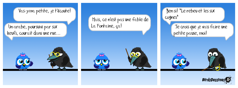 Case 1:Bird 1: Vas-y ma petite, je t'écoute!Bird 2: Un arabe, poursuivi par six keufs, courait dans une rue... | Case 2: Bird 1: Mais, ce n'est pas une fable de La Fontaine, ça! | Case 3: Bird 1: Ben si! "Le rebeu et les six cognes" Bird 2: Je crois que je vais faire une petite pause, moi!