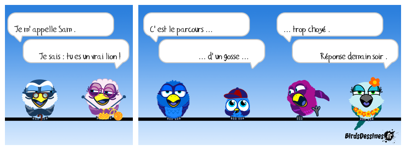 Case 1:Bird 1: Je m' appelle Sam .Bird 2: Je sais : tu es un vrai lion ! | Case 2: Bird 1: C' est le parcours ... Bird 2: ... d' un gosse ... | Case 3: Bird 1: ... trop choyé . Bird 2: Réponse demain soir .