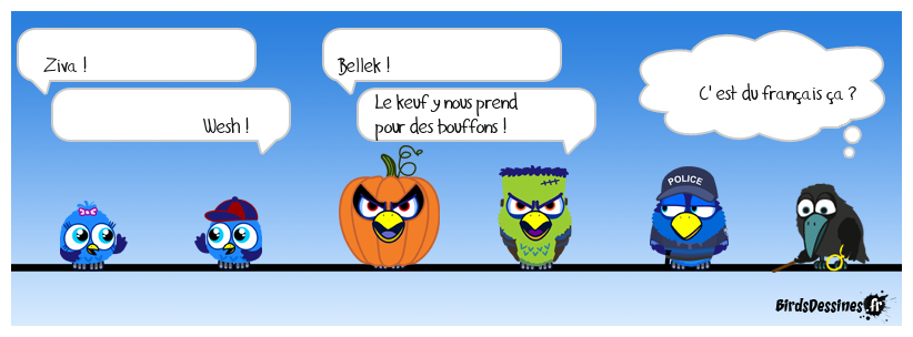 Case 1:Bird 1: Ziva ! Bird 2: Wesh ! | Case 2: Bird 1: Bellek ! Bird 2: Le keuf y nous prend pour des bouffons ! | Case 3: Bird 1: C' est du français ça ?