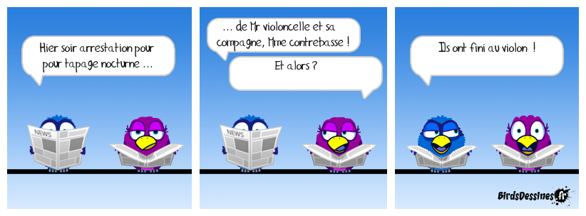 Case 1:Bird 1: Hier soir arrestation pour pour tapage nocturne ... | Case 2: Bird 1: ... de Mr violoncelle et sa compagne, Mme contrebasse ! Bird 2: Et alors ? | Case 3: Bird 1: Ils ont fini au violon !