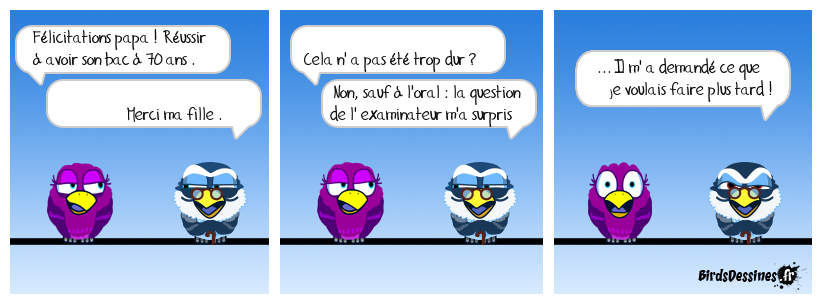 Case 1:Bird 1: Félicitations papa ! Réussir à avoir son bac à 70 ans .Bird 2: Merci ma fille . | Case 2: Bird 1: Cela n' a pas été trop dur ? Bird 2: Non, sauf à l'oral : la question de l' examinateur m'a surpris | Case 3: Bird 1: ... Il m' a demandé ce que je voulais faire plus tard !