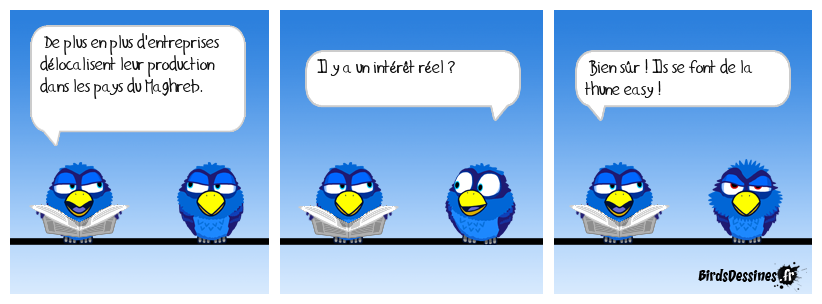 Case 1:Bird 1: De plus en plus d'entreprises délocalisent leur production dans les pays du Maghreb. | Case 2: Bird 1: Il y a un intérêt réel ? | Case 3: Bird 1: Bien sûr ! Ils se font de la thune easy !