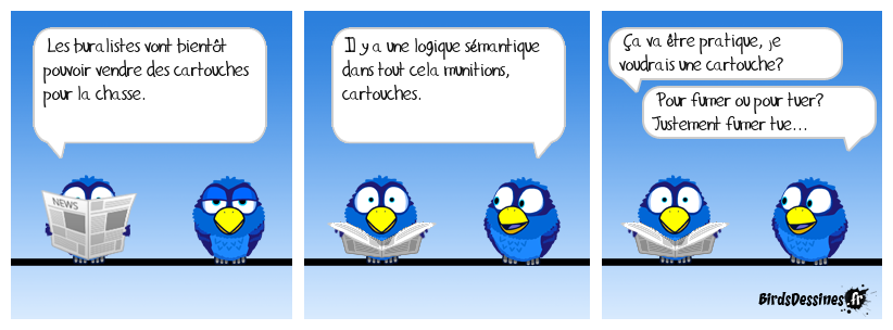 Case 1:Bird 1: Les buralistes vont bientôt pouvoir vendre des cartouches pour la chasse. | Case 2: Bird 1: Il y a une logique sémantique dans tout cela munitions, cartouches. | Case 3: Bird 1: Ça va être pratique, je voudrais une cartouche? Bird 2: Pour fumer ou pour tuer? Justement fumer tue...