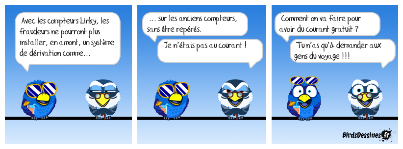 Case 1:Bird 1: Avec les compteurs Linky, les fraudeurs ne pourront plus installer, en amont, un système de dérivation comme... | Case 2: Bird 1: ... sur les anciens compteurs, sans être repérés. Bird 2: Je n’étais pas au courant ! | Case 3: Bird 1: Comment on va faire pour avoir du courant gratuit ? Bird 2: Tu n’as qu’à demander aux gens du voyage !!!