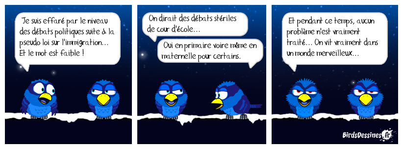 Case 1:Bird 1: Je suis effaré par le niveau des débats politiques suite à la pseudo loi sur l'immigration... Et le mot est faible ! | Case 2: Bird 1: On dirait des débats stériles de cour d'école... Bird 2: Oui en primaire voire même en maternelle pour certains. | Case 3: Bird 1: Et pendant ce temps, aucun problème n'est vraiment traité... On vit vraiment dans un monde merveilleux...