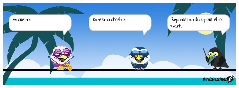 Case 1:Bird 1: En cuisine. | Case 2: Bird 1: Dans un orchestre. | Case 3: Bird 1: Réponse mardi ou peut-être avant.