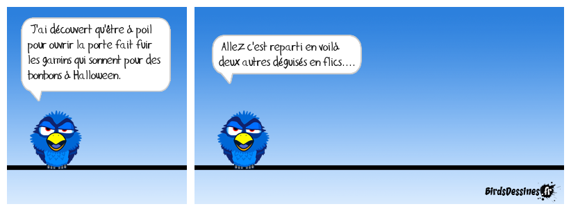Case 1:Bird 1: J'ai découvert qu'être à poil pour ouvrir la porte fait fuir les gamins qui sonnent pour des bonbons à Halloween. | Case 2: Bird 1: Allez c'est reparti en voilà deux autres déguisés en flics.... | Case 3: