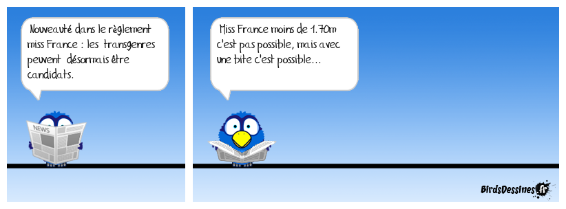 Case 1:Bird 1: Nouveauté dans le règlement miss France : les transgenres peuvent désormais être candidats. | Case 2: Bird 1: Miss France moins de 1.70m c'est pas possible, mais avec une bite c'est possible... | Case 3:
