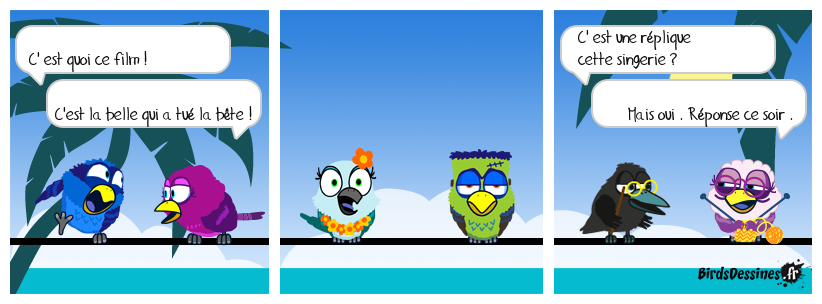 Case 1:Bird 1: C' est quoi ce film !Bird 2: C'est la belle qui a tué la bête ! | Case 2: | Case 3: Bird 1: C' est une réplique cette singerie ? Bird 2: Mais oui . Réponse ce soir .