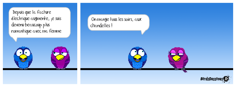 Case 1:Bird 1: Depuis que la facture électrique augmente, je suis devenu beaucoup plus romantique avec ma femme | Case 2: Bird 1: On mange tous les soirs, aux chandelles ! | Case 3: